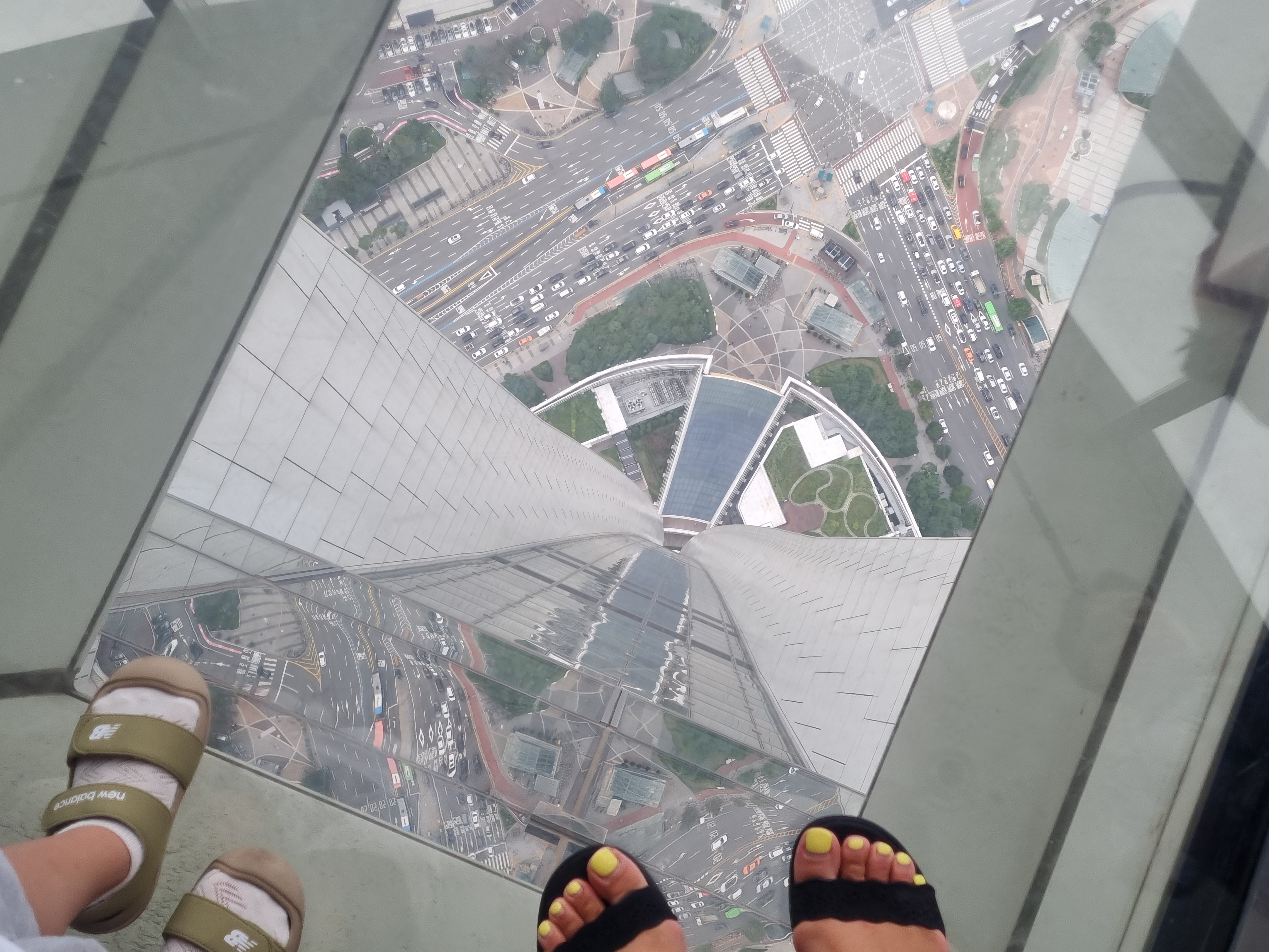 저희는 우선 인증샷을 위해 바닥이 유리로 된 부분으로 가보았습니다. 저는 생각보다 훨씬 무섭게 느껴져 유리 바닥에 오래 서있기가 힘들더라고요;; 아이도 엄청 무서워하며 중간에 철로 된 부분으로만 걸어 다니려고 했습니다 ㅋㅋㅋ