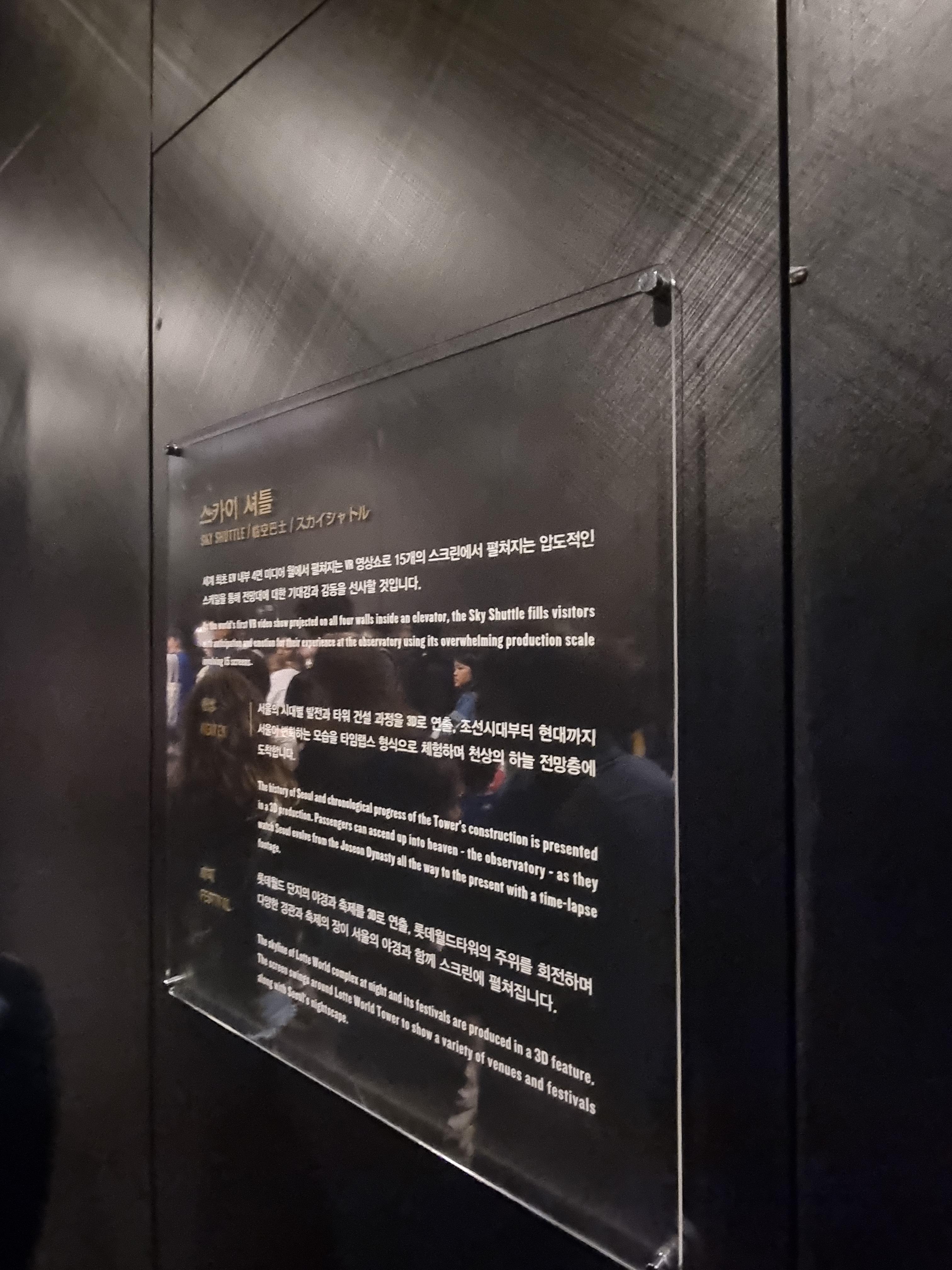 설명에서 읽어보았듯이 엘리베이터 내부에서는 화려한 영상쇼가 계속 나옵니다. 올라가는 짧은 시간 동안 지루할 틈이 없습니다.