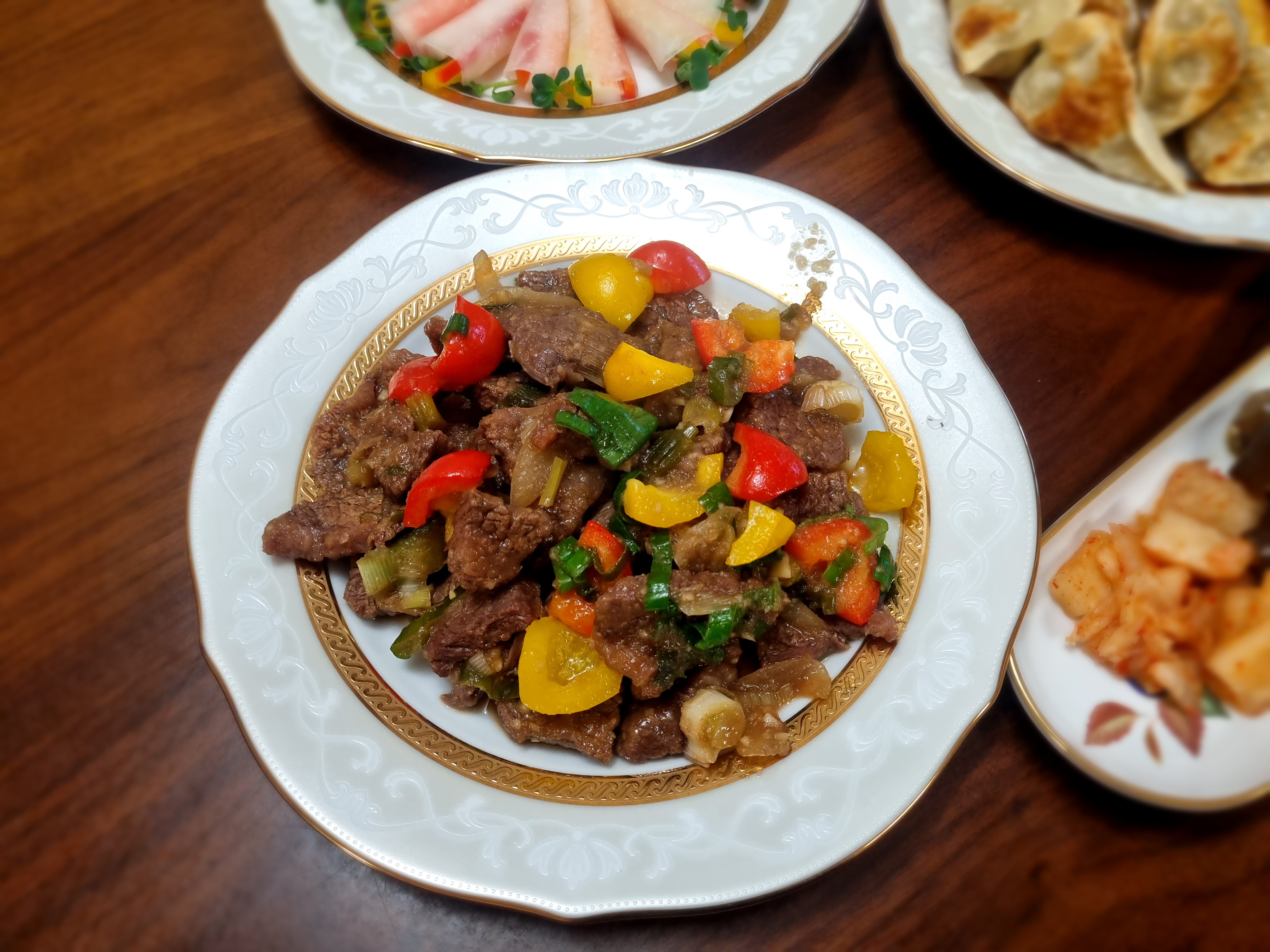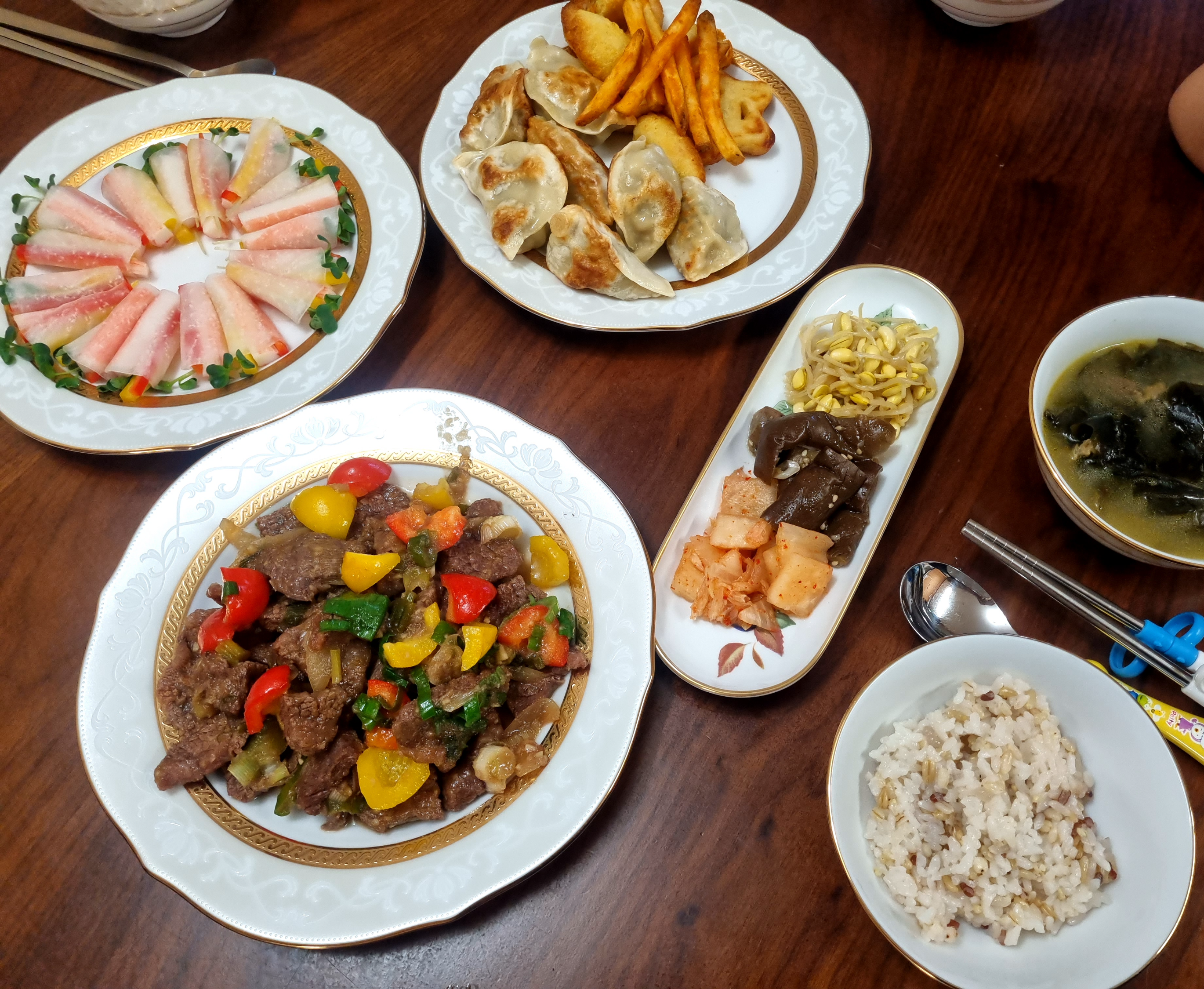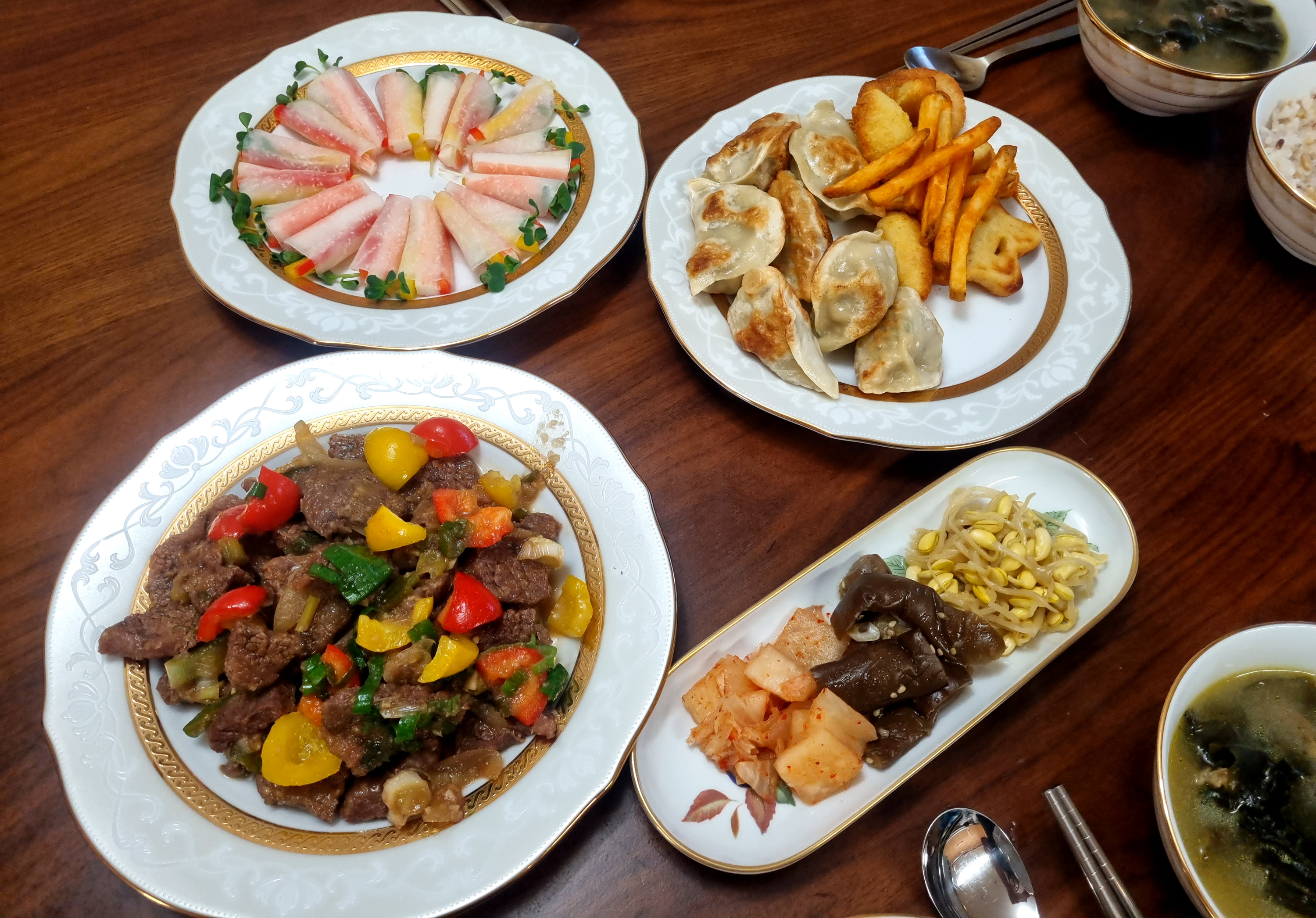 무쌈, 양념갈비, 군만두&튀김, 나물 및 김치반찬이다