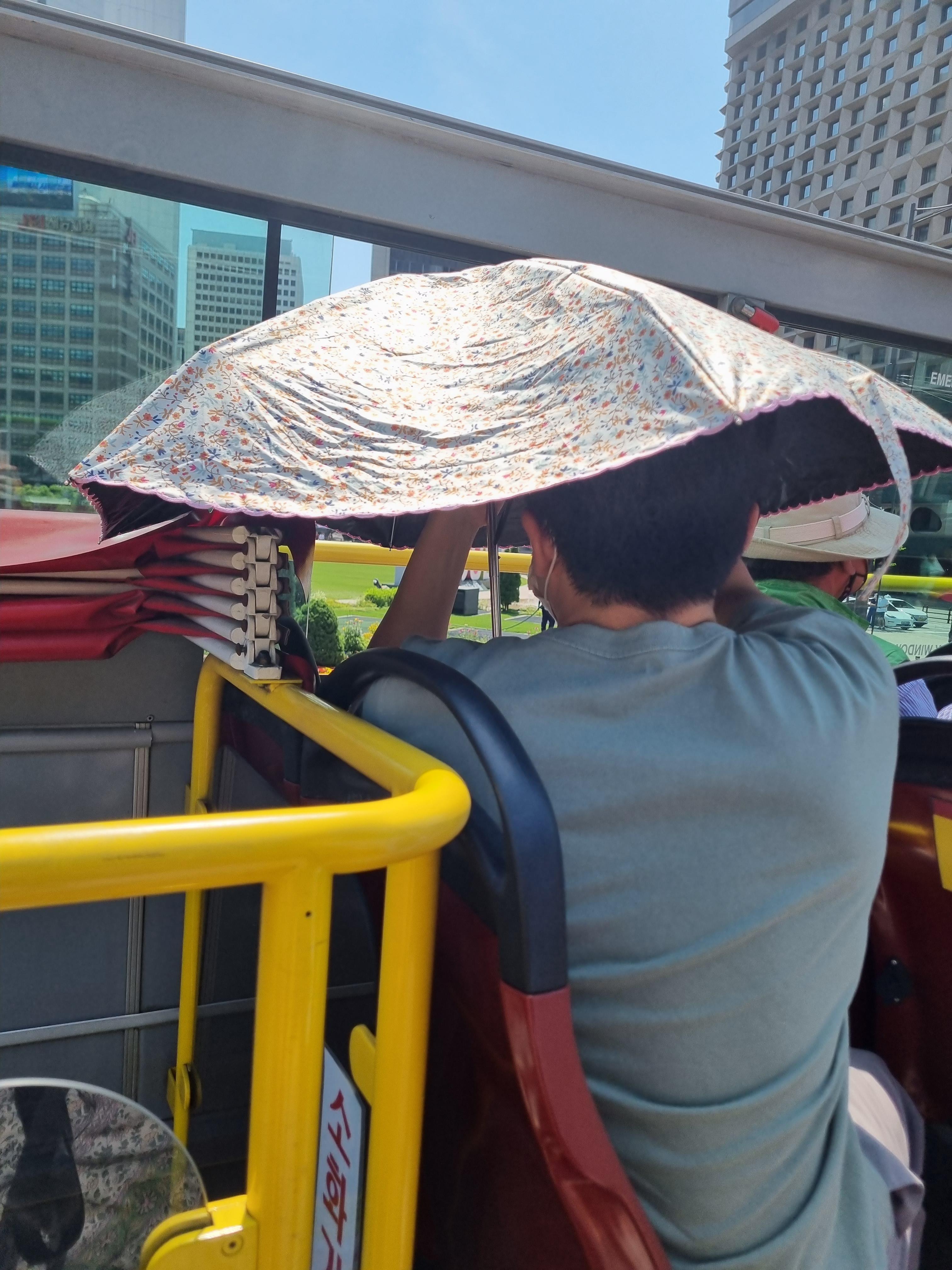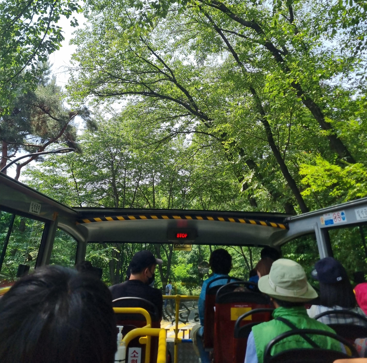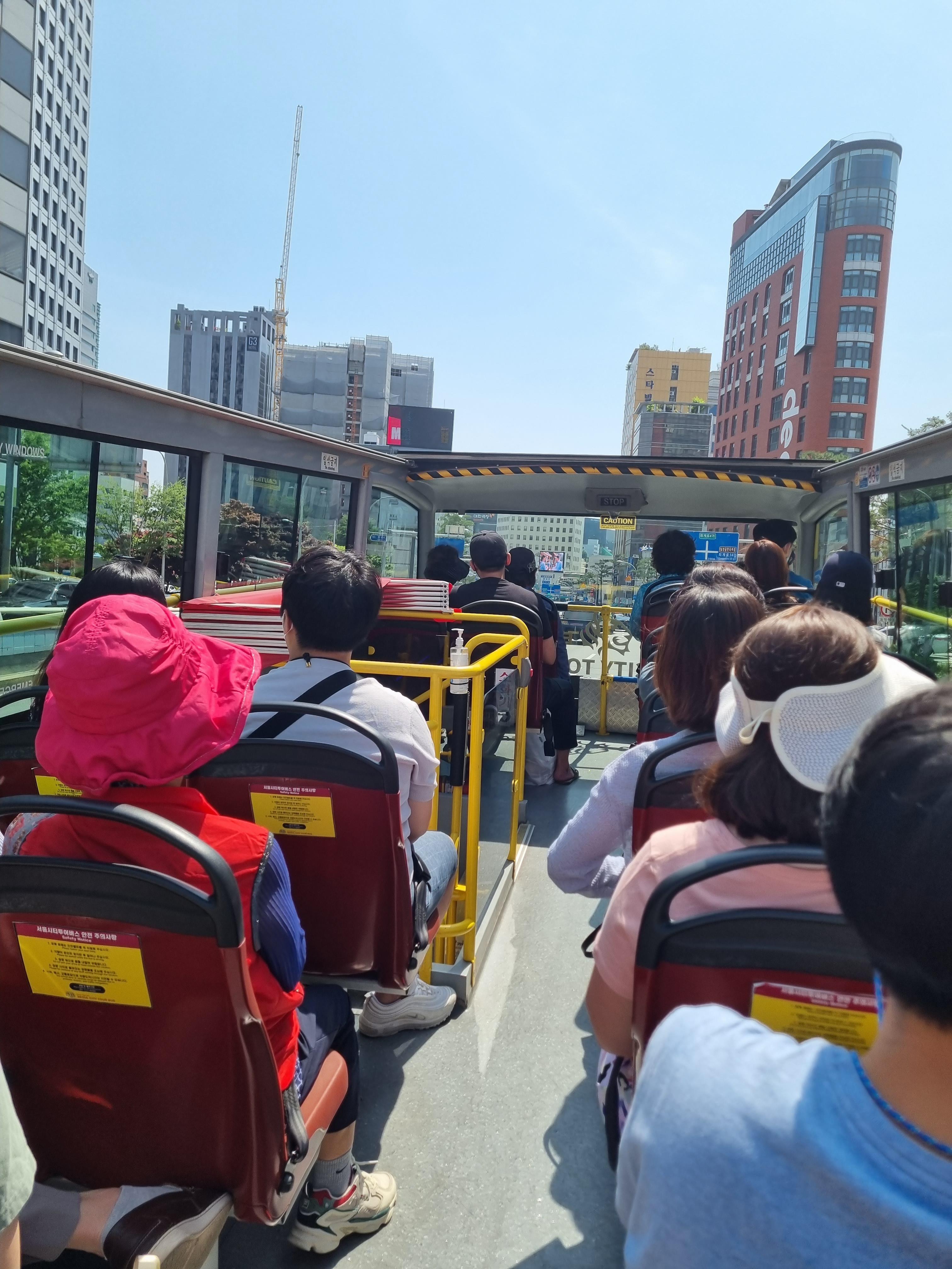 저희는 버스 2층 자리에 앉았습니다. 2층 자리 경쟁이 나름 치열하니 줄을 일찍 서있는게 좋습니다. 이렇게 지붕이 뚫려 있어 쌩쌩 달리니 시원하고 좋았습니다.