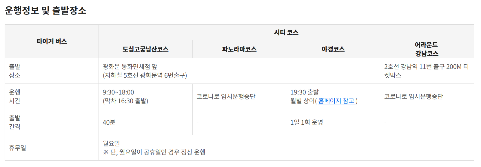 도심 고궁 코스 시티투어버스는 광화문 동화면세점 앞에서 출발합니다. 그 앞으로 가시면 여러 사람들이 줄 서 있는 곳을 발견하실 수 있습니다. 첫차는 오전 9시 반, 막차는 오후 4시 반에 출발입니다.