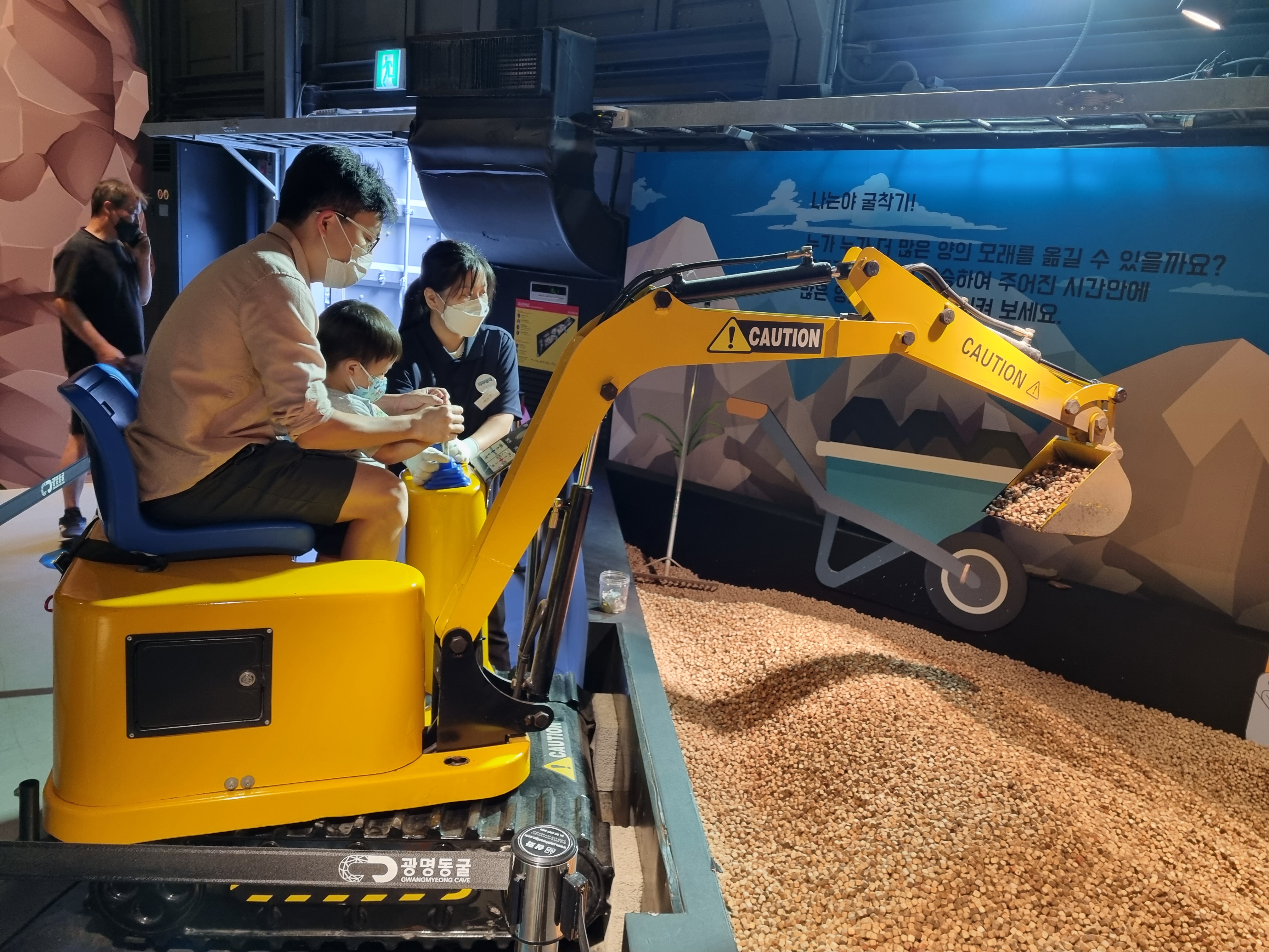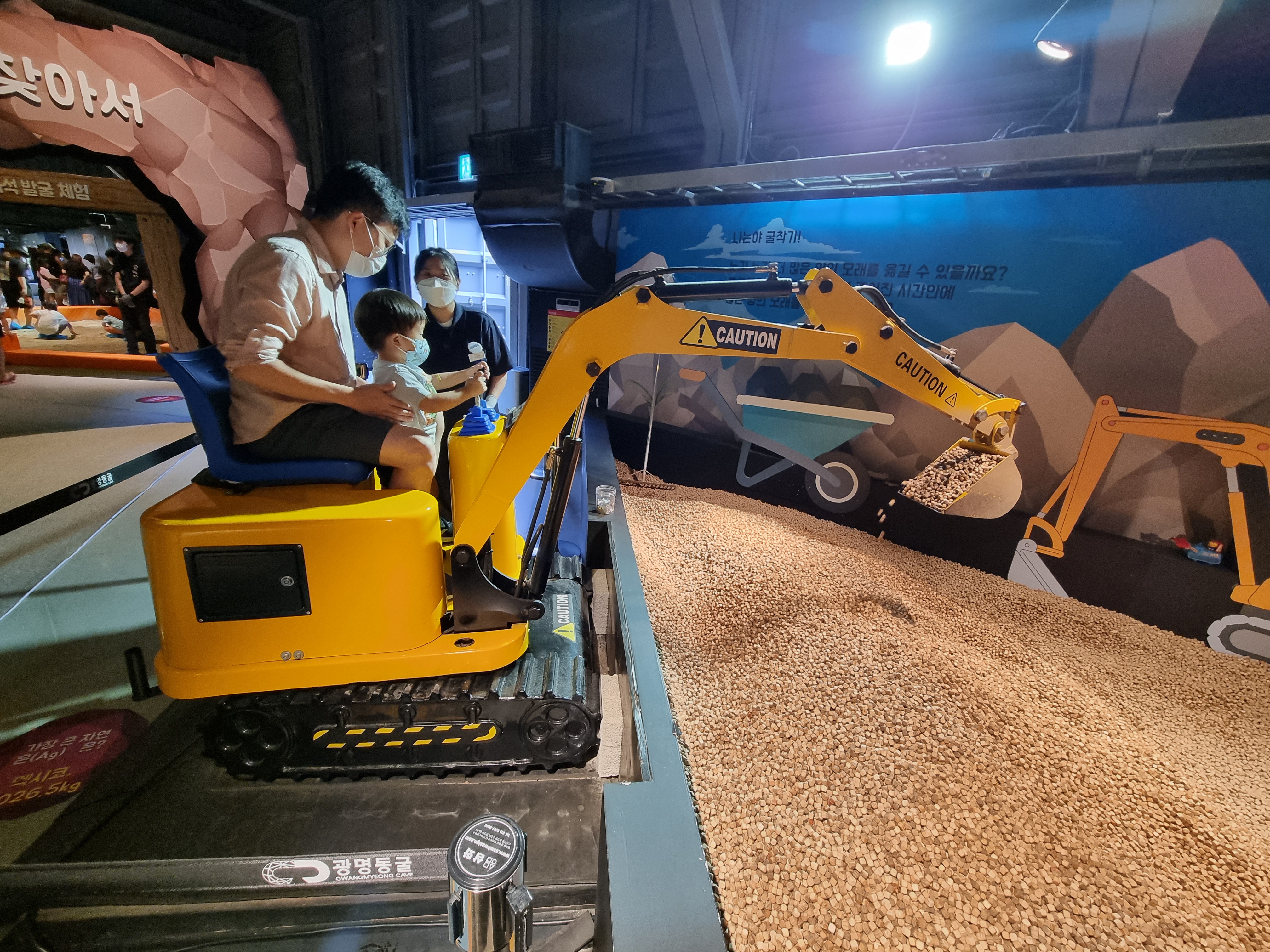 광명동굴 막바지에 다다르면 아이들이 매우 좋아할 여러 체험 장소가 나옵니다. 그중 최고 인기 코너는 미니 포크레인! 1~2분 간 나이가 직접 포크레인을 조작해 편백을 퍼올릴 수 있어 정말 좋아합니다. 주말에는 줄이 다소 길어 꽤 오래 기다려야 합니다.