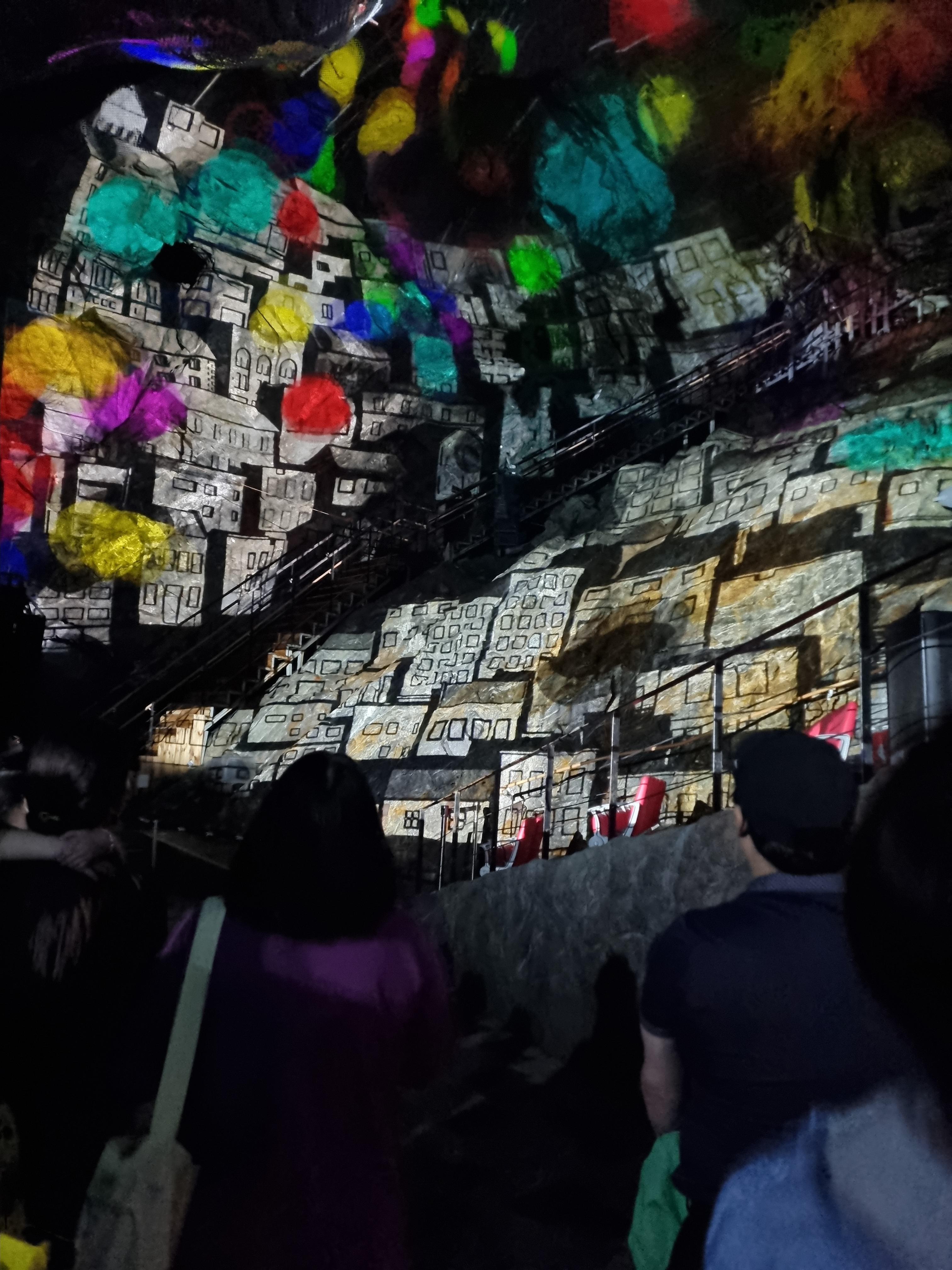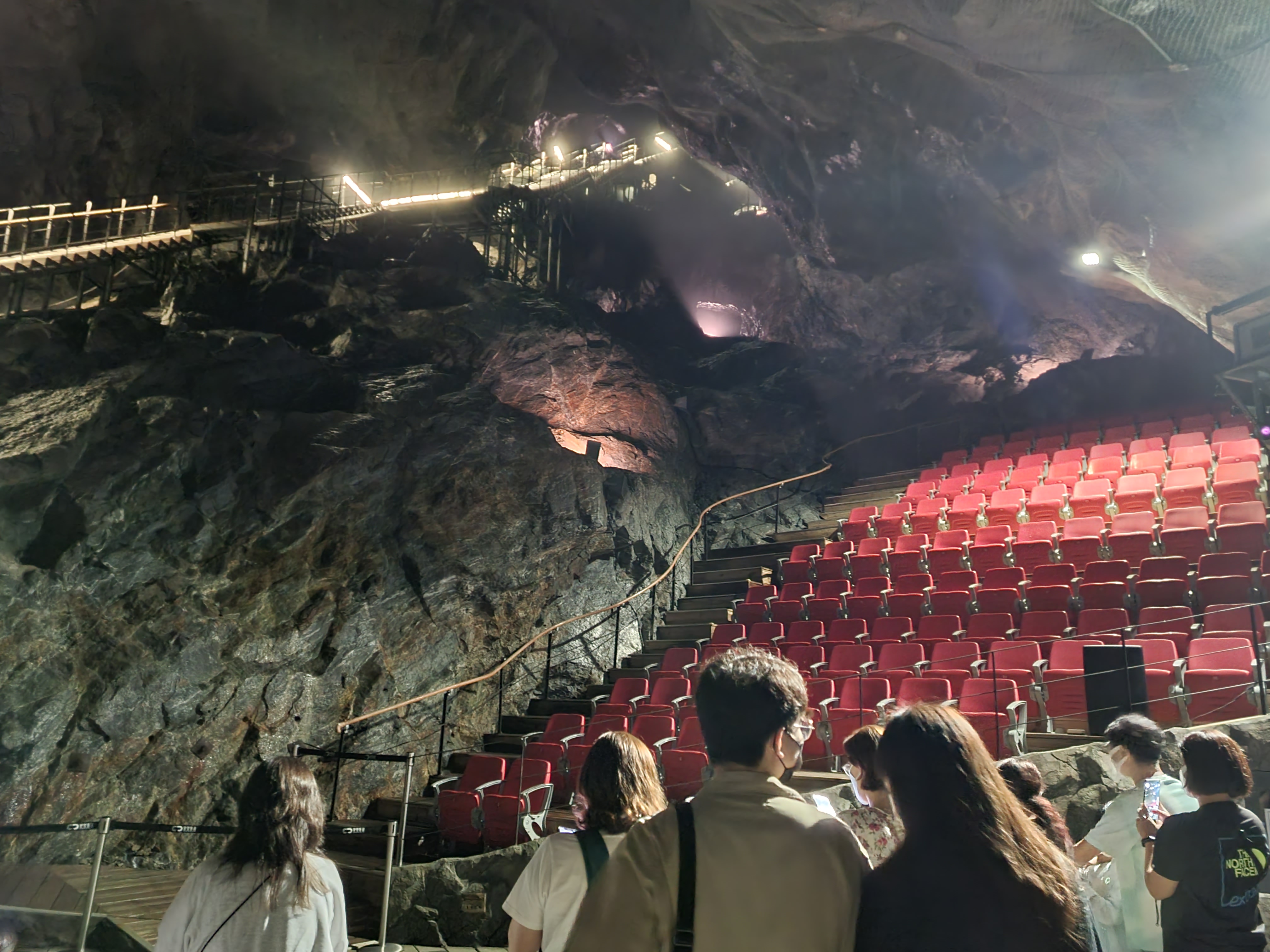 광명동굴에서 제일 재밌고 멋있었던 공간 중 하나는 동굴 극장입니다. 동굴 안에 좌석이 설치되어 있는 대형 극장인데 한쪽 벽에 몇 분 간 아름다운 미디어 아트와 음악을 상영해 줍니다.