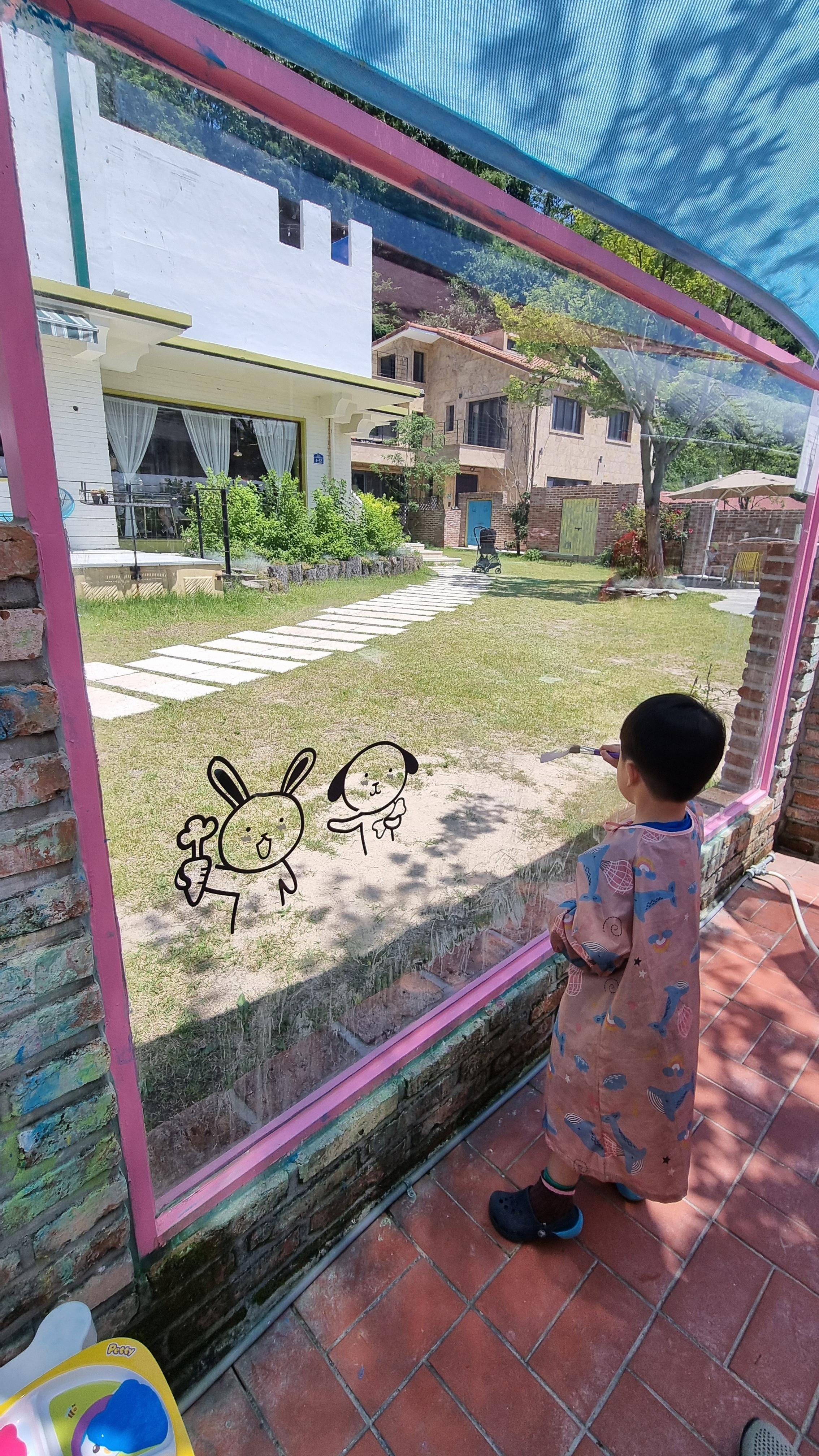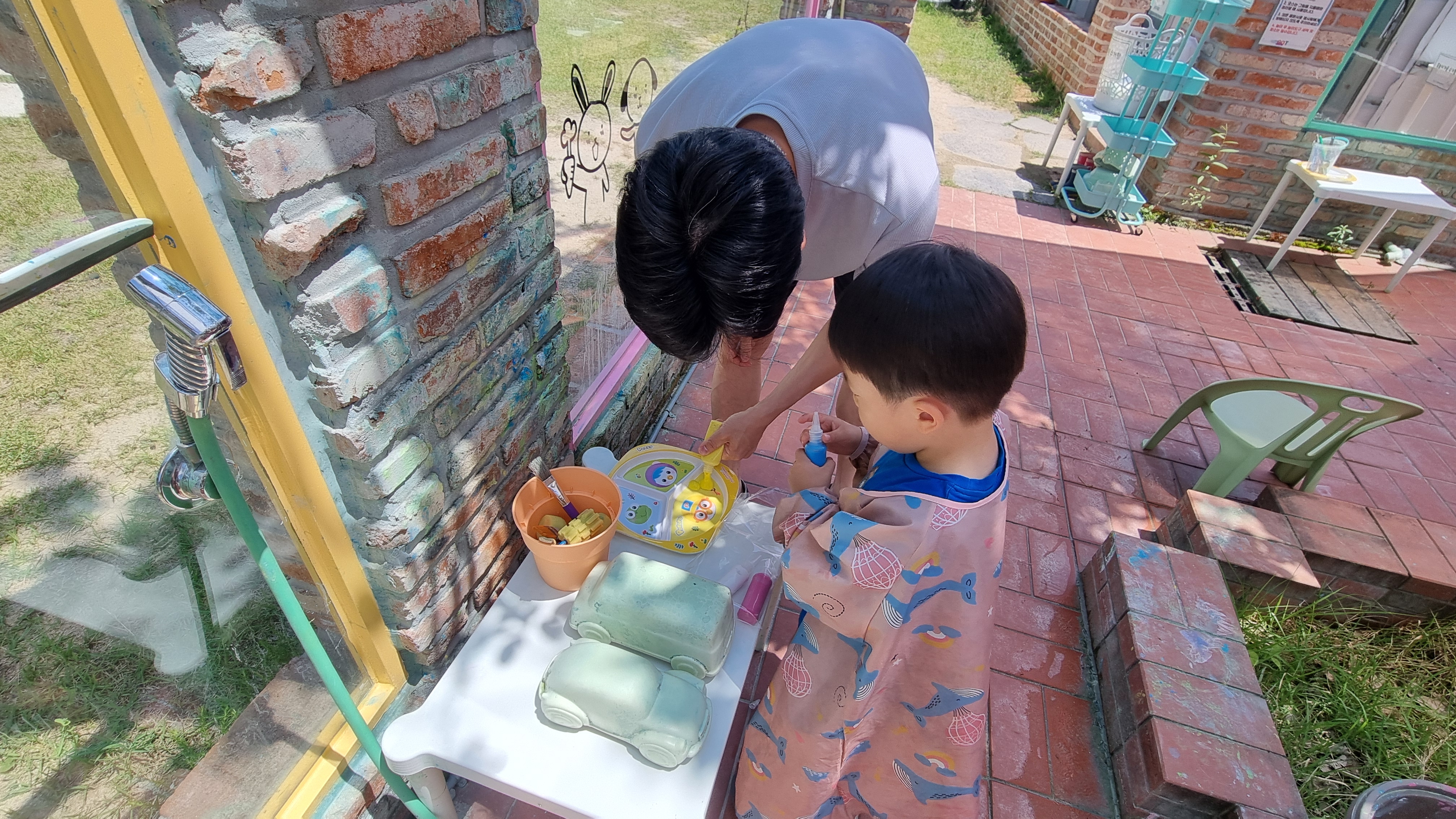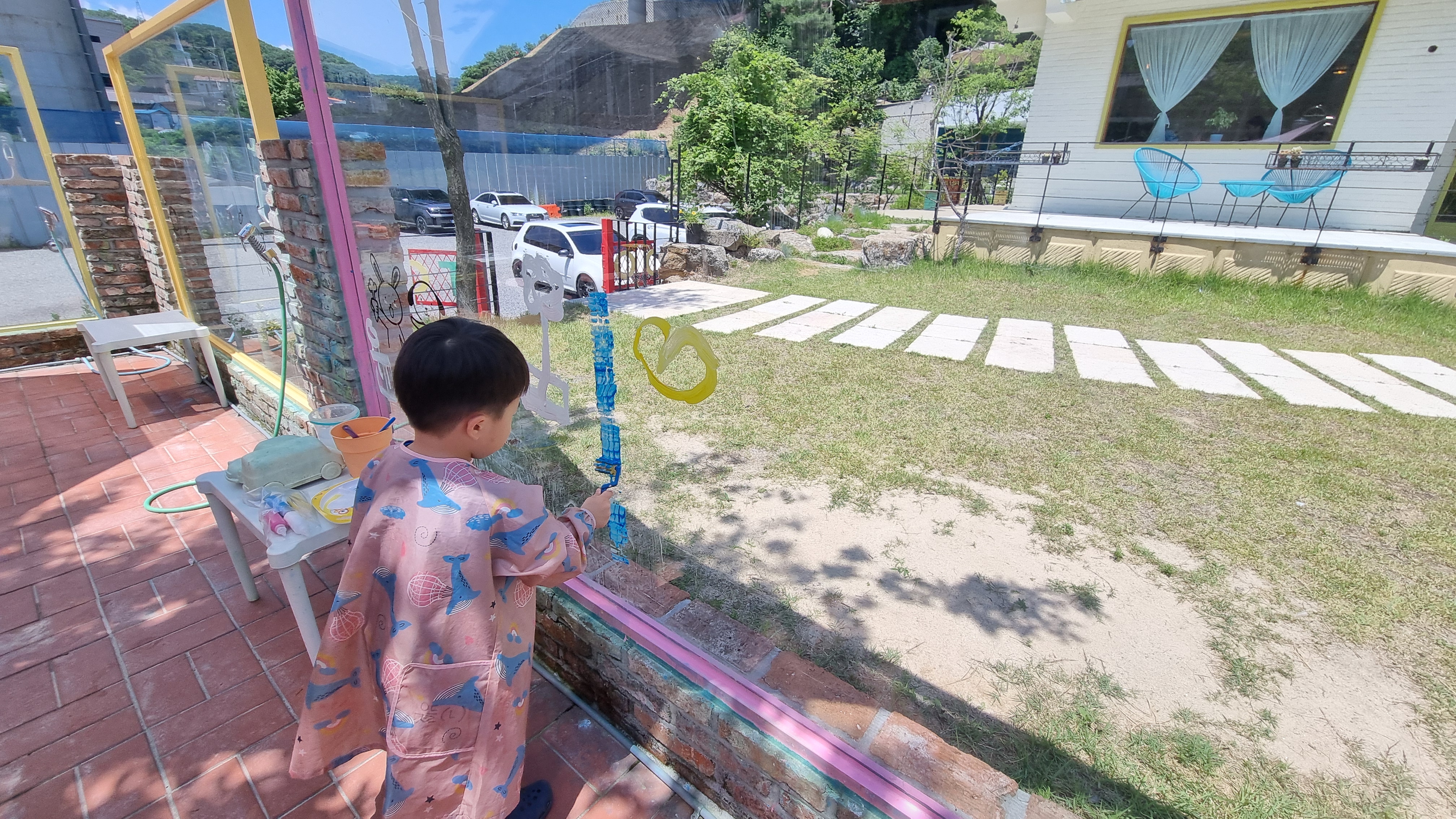 저희는 야외 물감놀이를 선택해서 야외의 큰 유리벽에 마음껏 물감으로 그림을 그리고 놀게 해주었습니다. 세가지 색깔의 물감 세 통과 붓, 물통, 롤러 등의 도구가 제공됩니다. 체험 공간도 이쁘게 꾸며져 있어 사진을 찍으면 정말 잘 나옵니다.