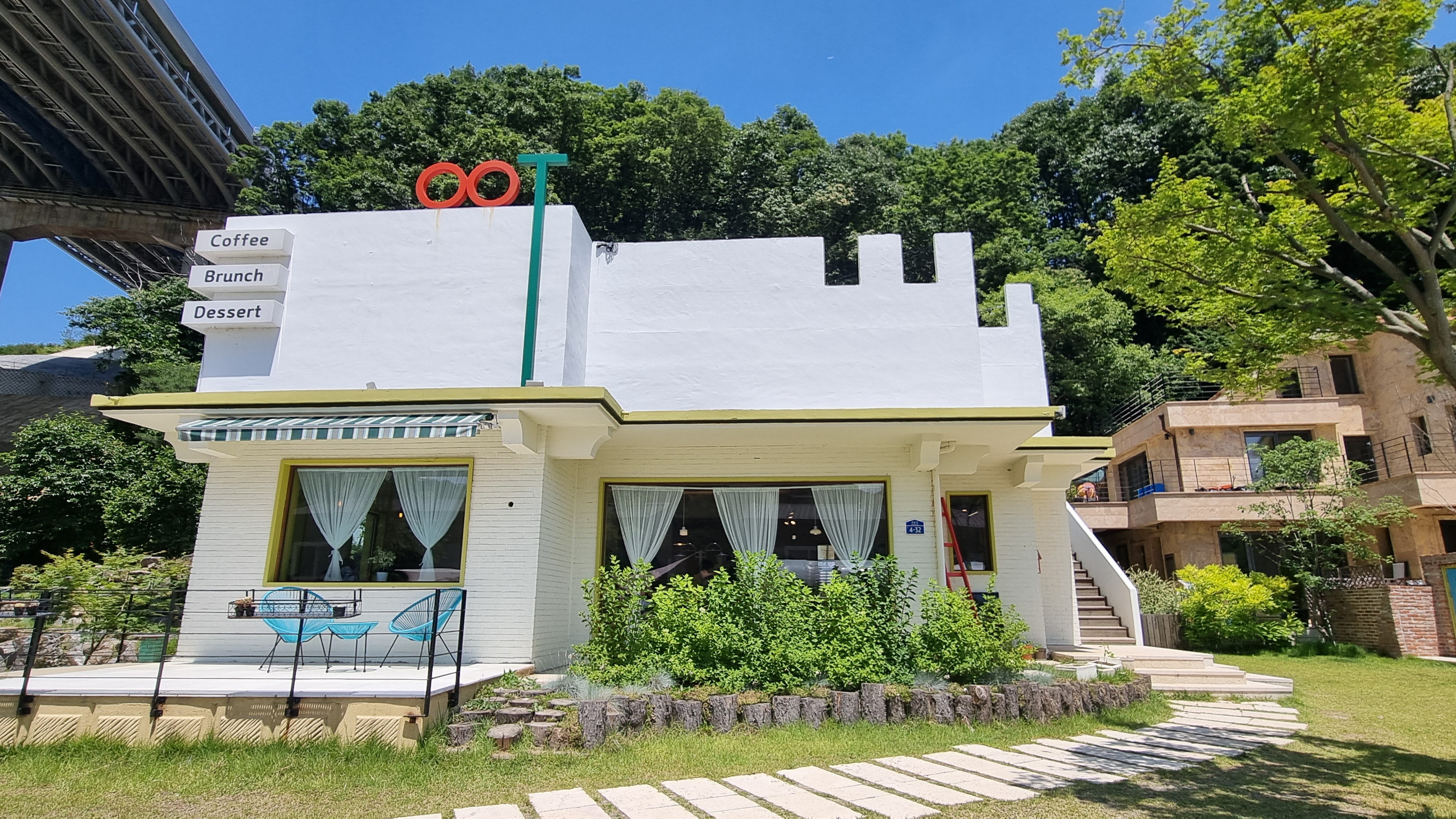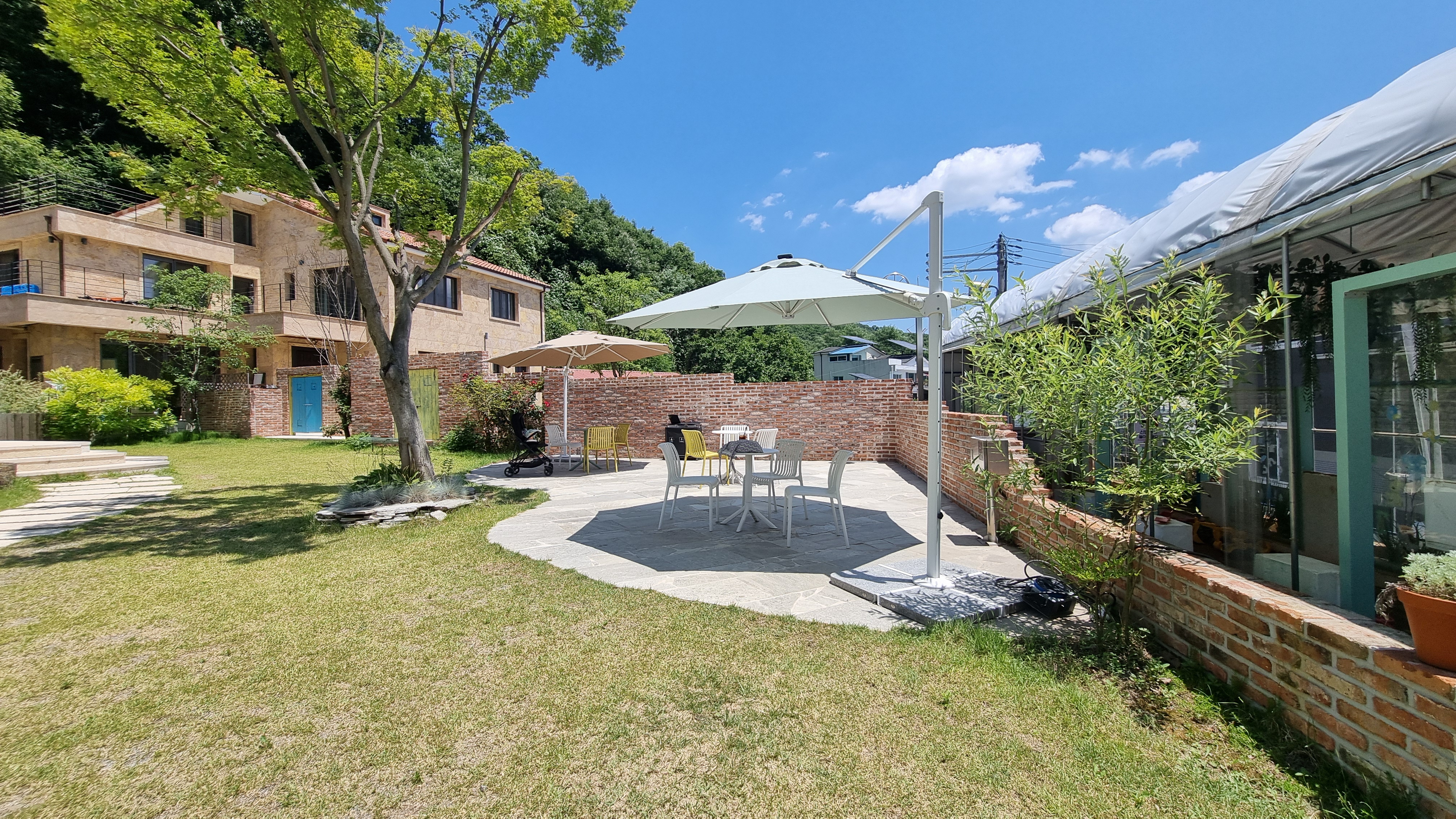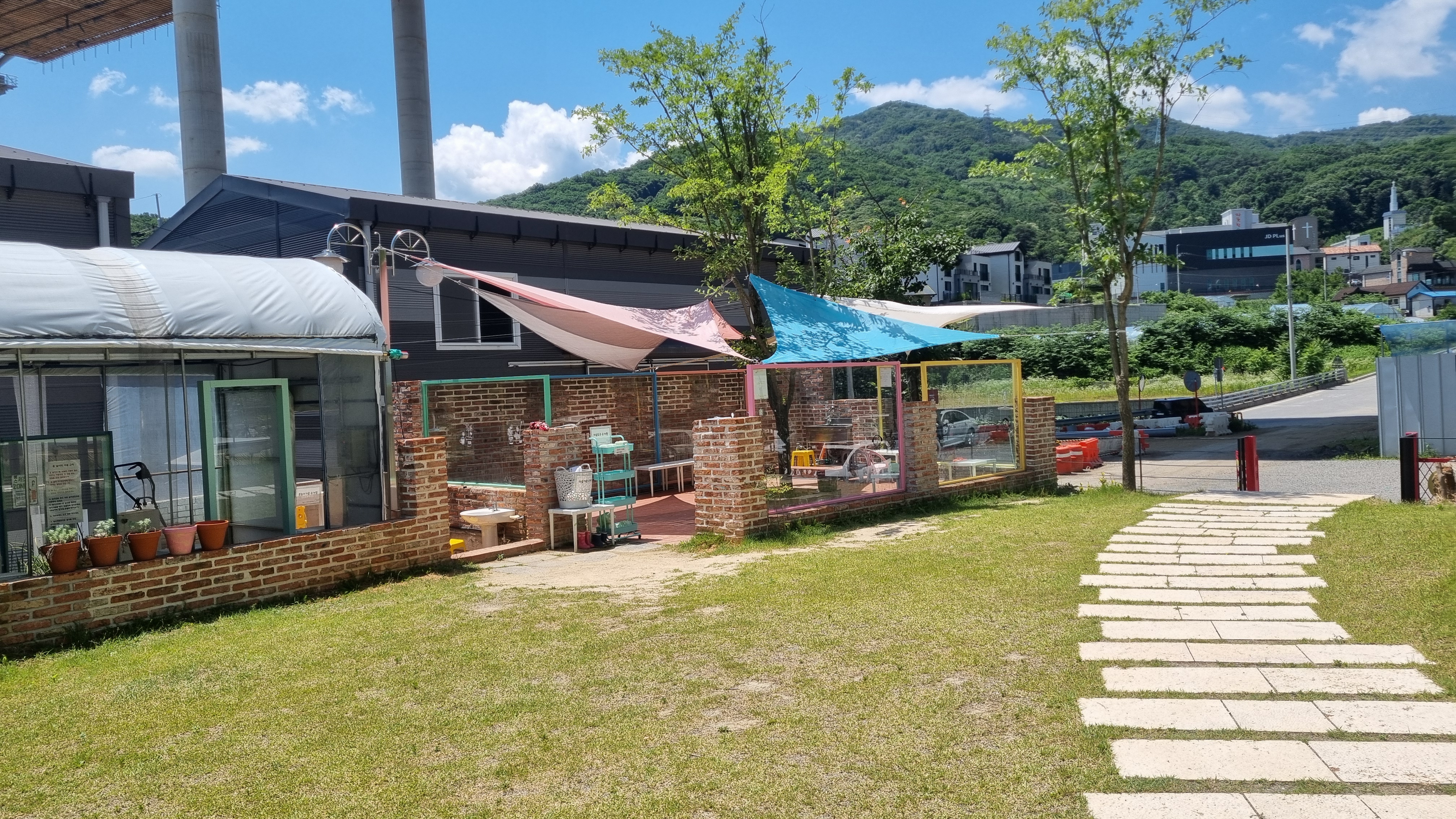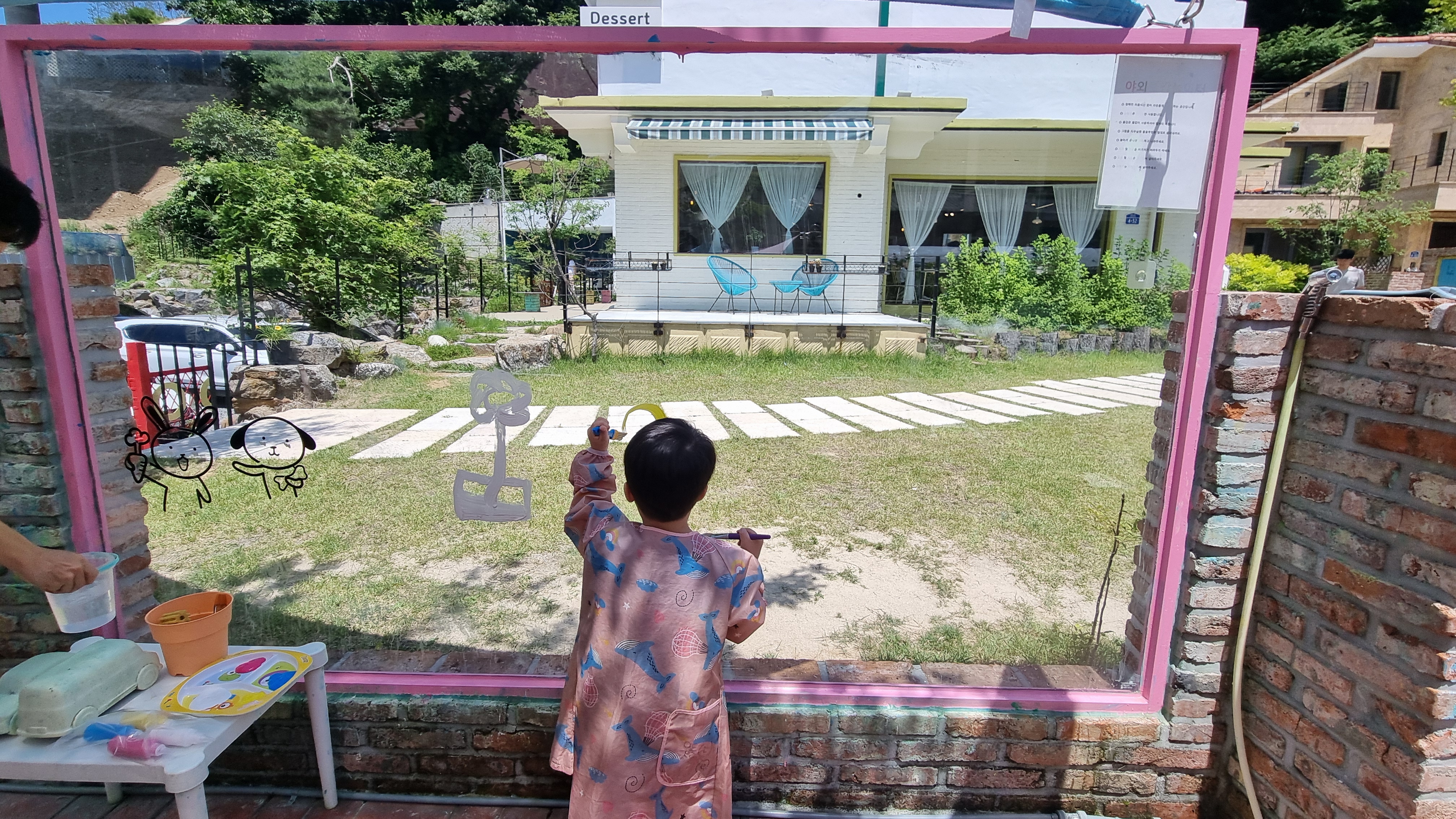 체험 공간 옆에는 앉아서 쉴 수 있는 야외 좌석도 구비되어 있습니다. 저는 여기서 커피를 마시며 아이가 물감놀이 하는 걸 구경했습니다.