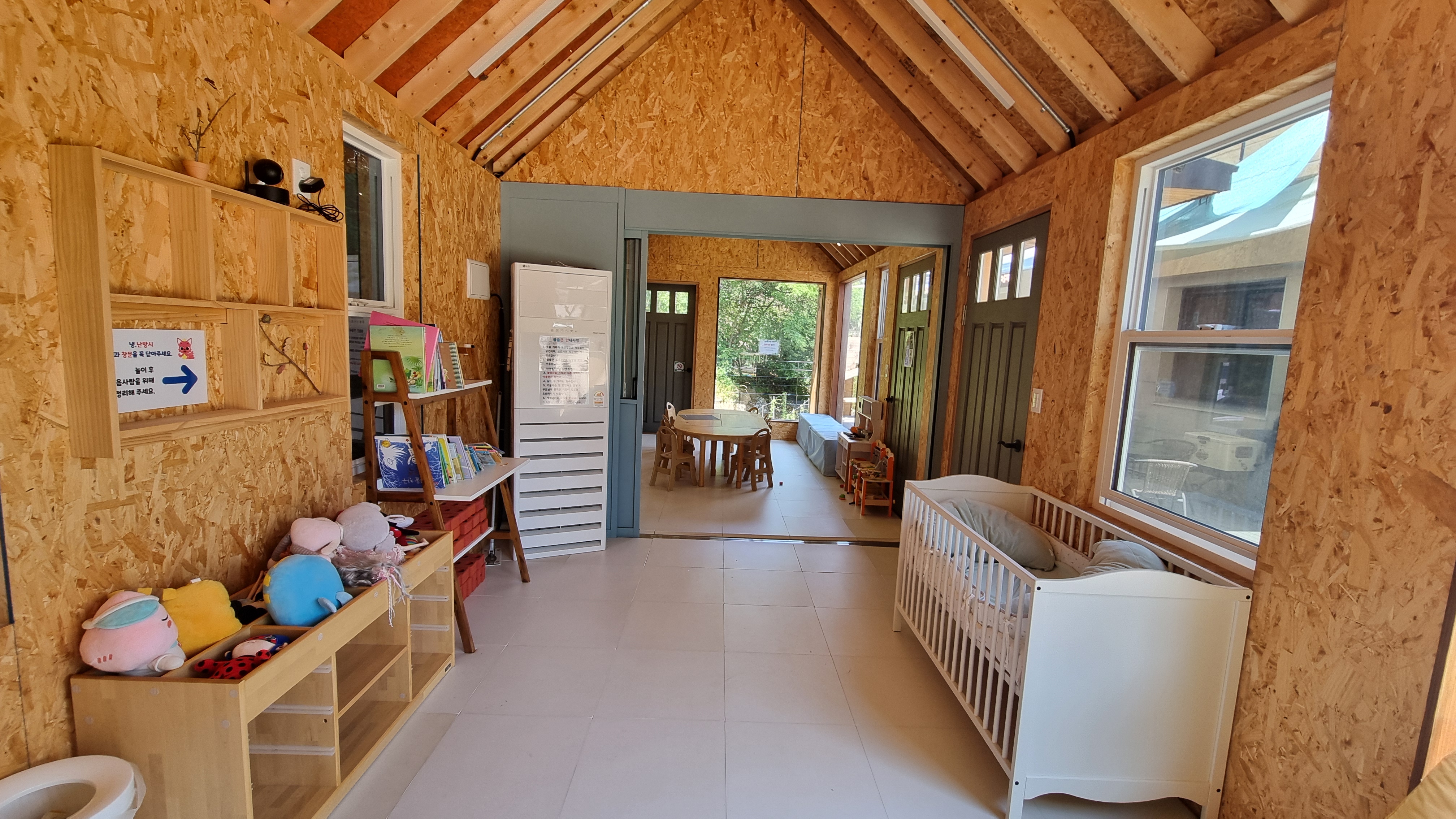 2층 야외 놀이터 한쪽에는 다락방 같은 실내 놀이방이 있습니다. 밖에서 놀다가 너무 더우면 이 곳에 들어와 시원하게 더위를 식히고 놀기 좋았습니다. 벽돌블록, 주방놀이, 책, 인형, 장난감 등 소소한 놀거리들이 구비되어 있습니다.