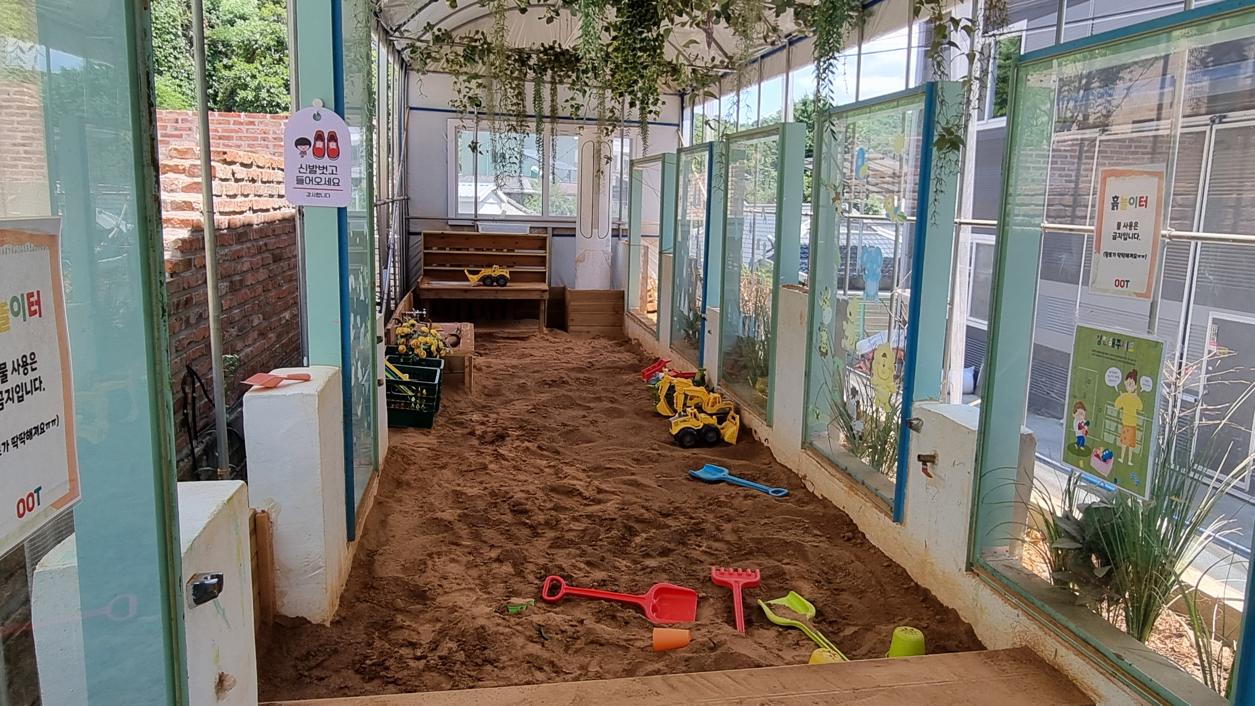 야외 물감놀이 체험 공간 옆에는 위와 같은 흙놀이 체험 공간이 있습니다. 실내 공간 안에 있어 비가 오는 날에도 이용할 수 있을 것 같습니다. 흙 상태도 깨끗하고 좋아 보였습니다.