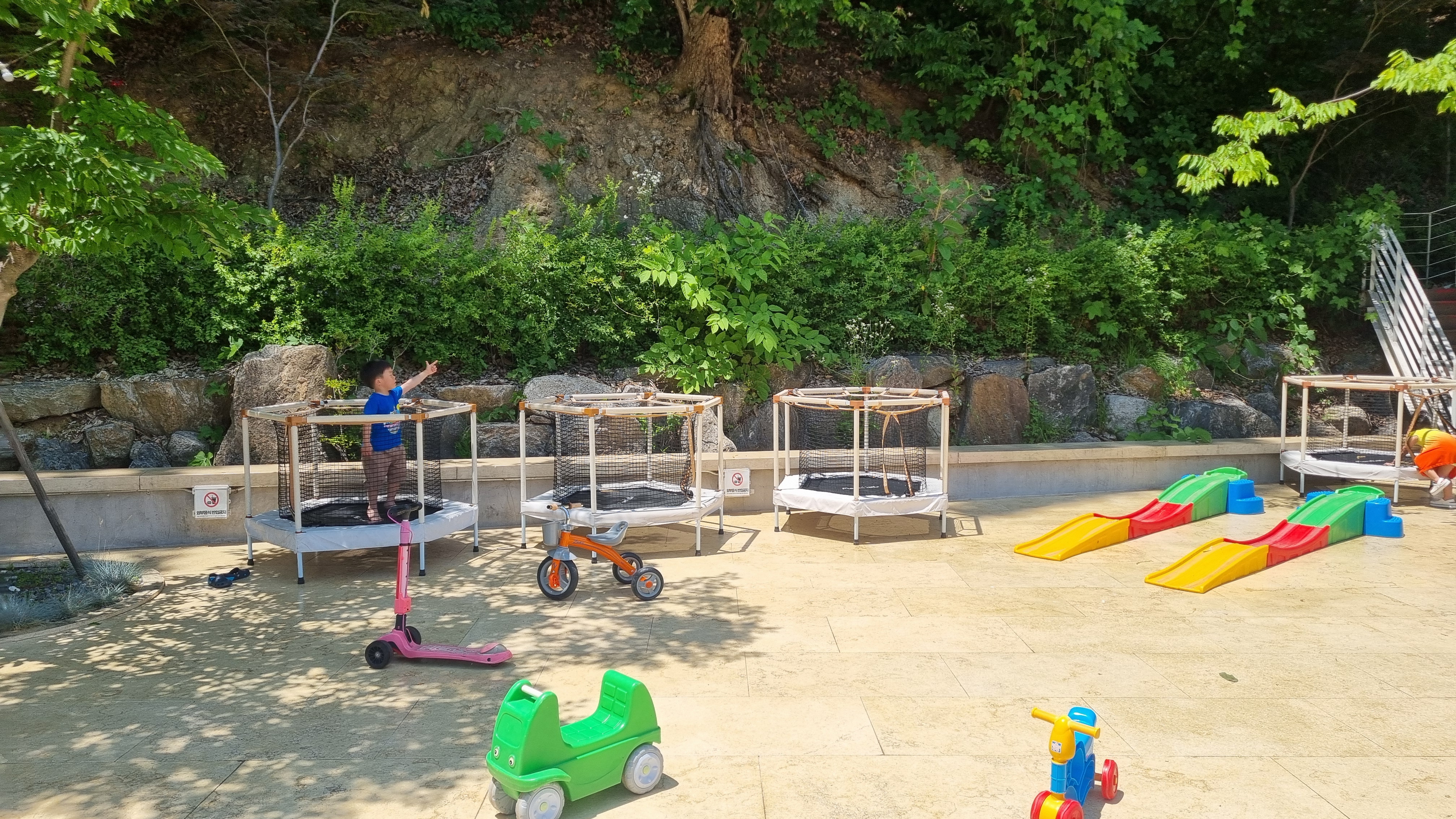 점심을 먹은 후 이번에는 2층 테라스의 야외 놀이터로 올라가 놀았습니다. 트램폴린, 자전거, 농구대 등 아이들이 놀거리가 풍부해서 이곳에서도 꽤 오랜 시간 놀았습니다.