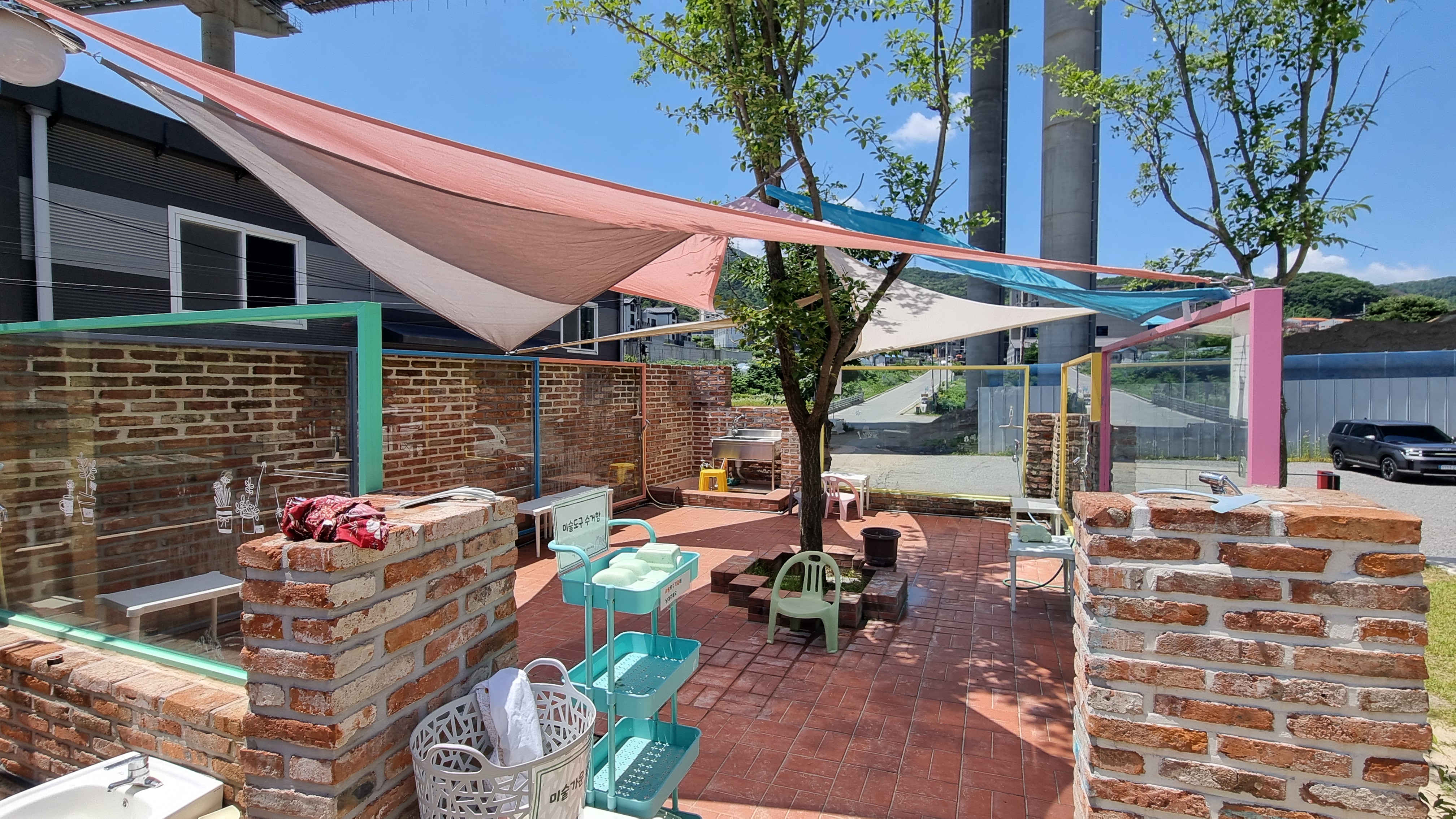 들어가기 전에 야외 물감놀이 체험 공간을 살펴보았는데 상당히 깨끗하게 잘 관리되어 있는 것 같았습니다. 위에 천막도 설치되어 있어 햇빛이 뜨거운 날에도 그늘 아래서 시원하게 물감놀이를 할 수 있습니다.