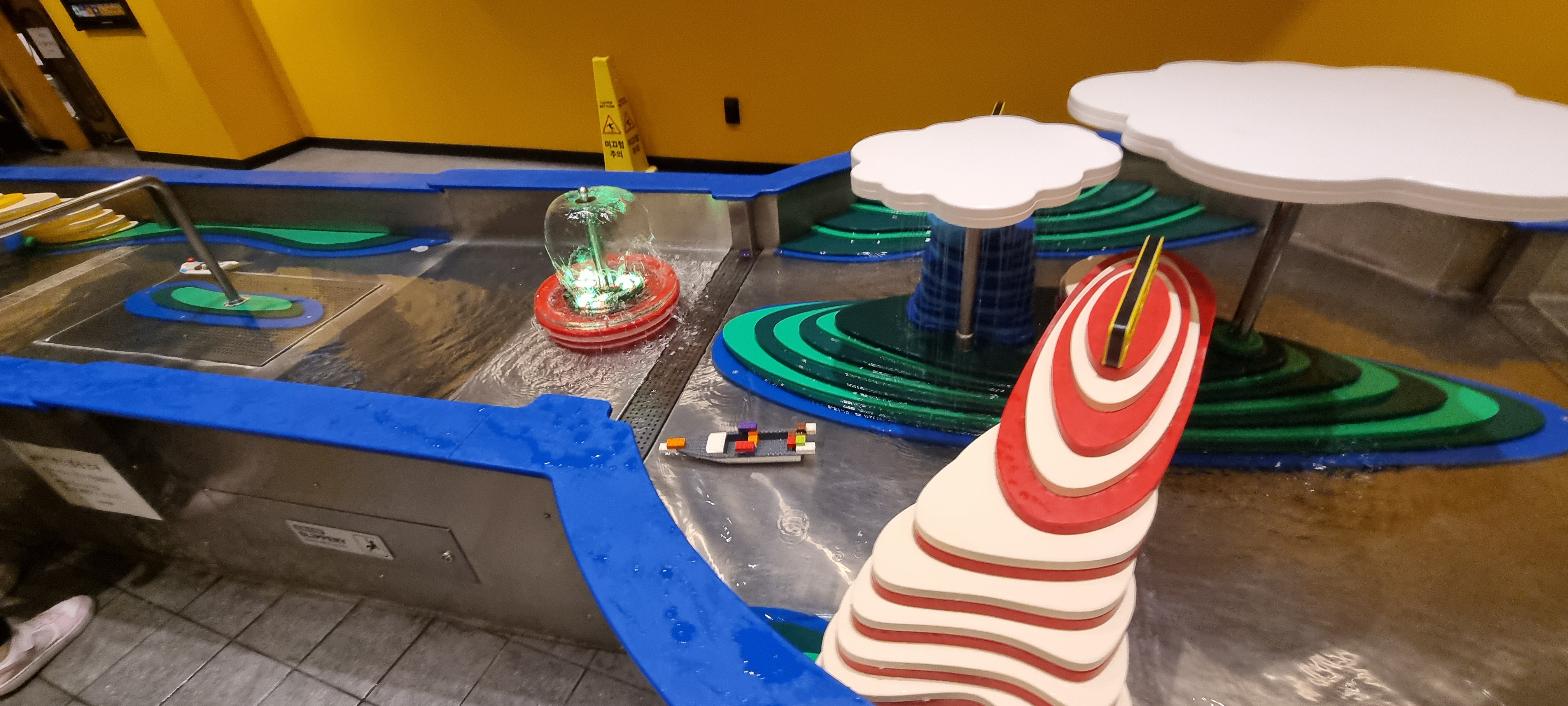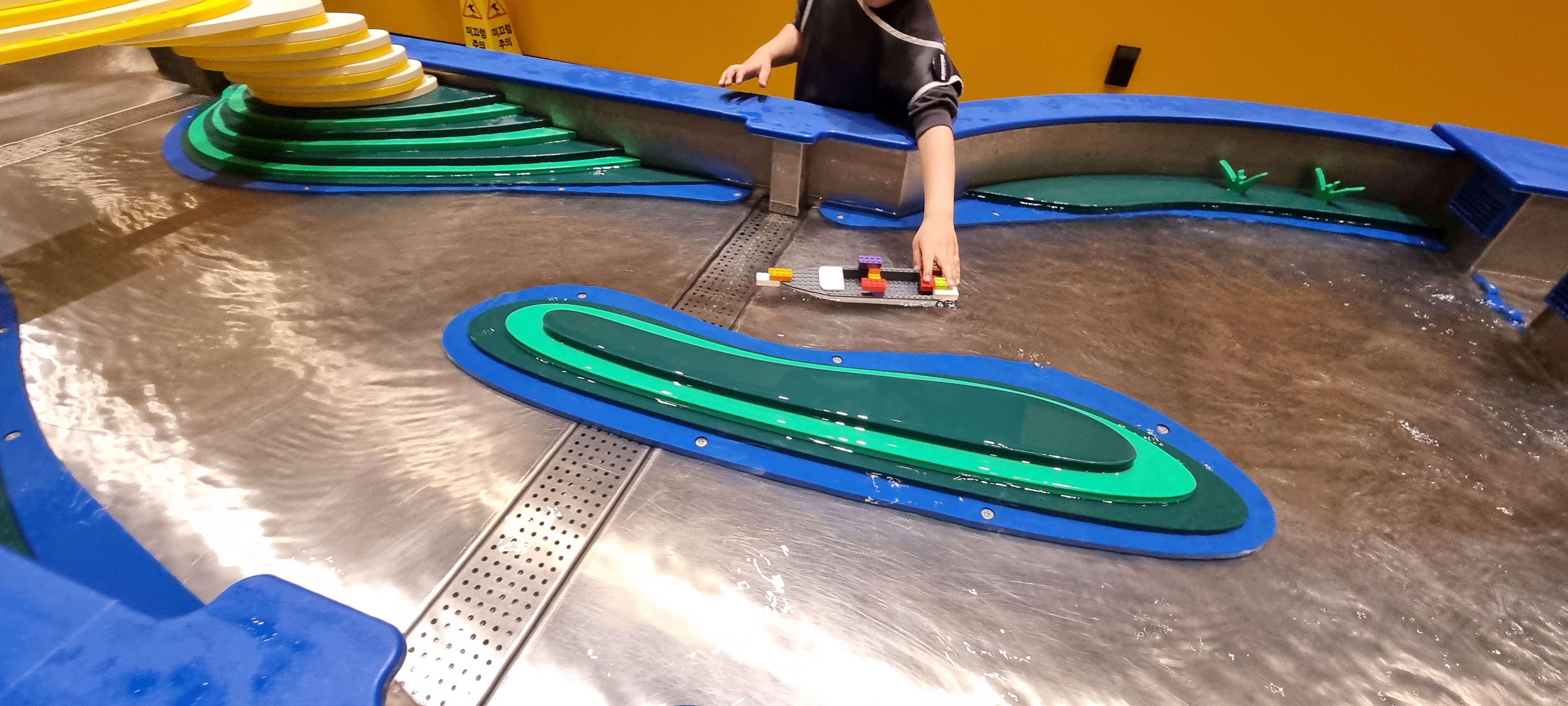 레고로 배를 만들어서 물에 흘려보내는 놀이를 체험할 수 있다