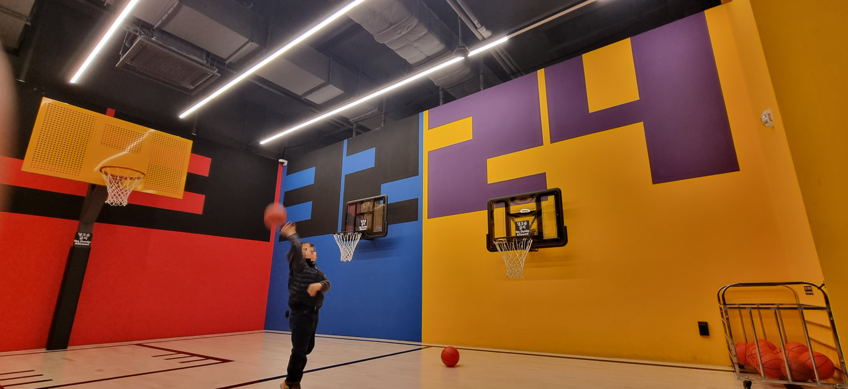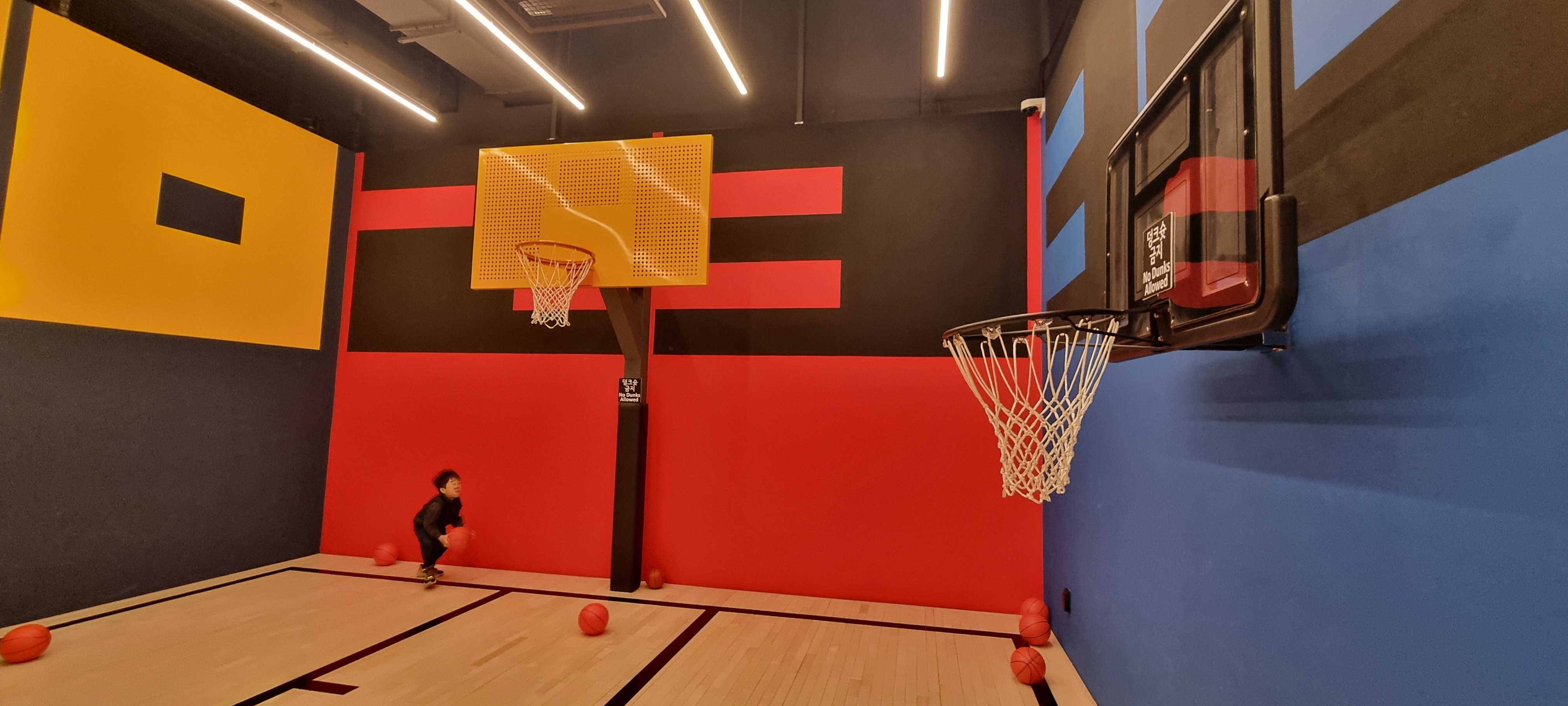 다양한 높이의 농구대가 있는 농구 코트에서는