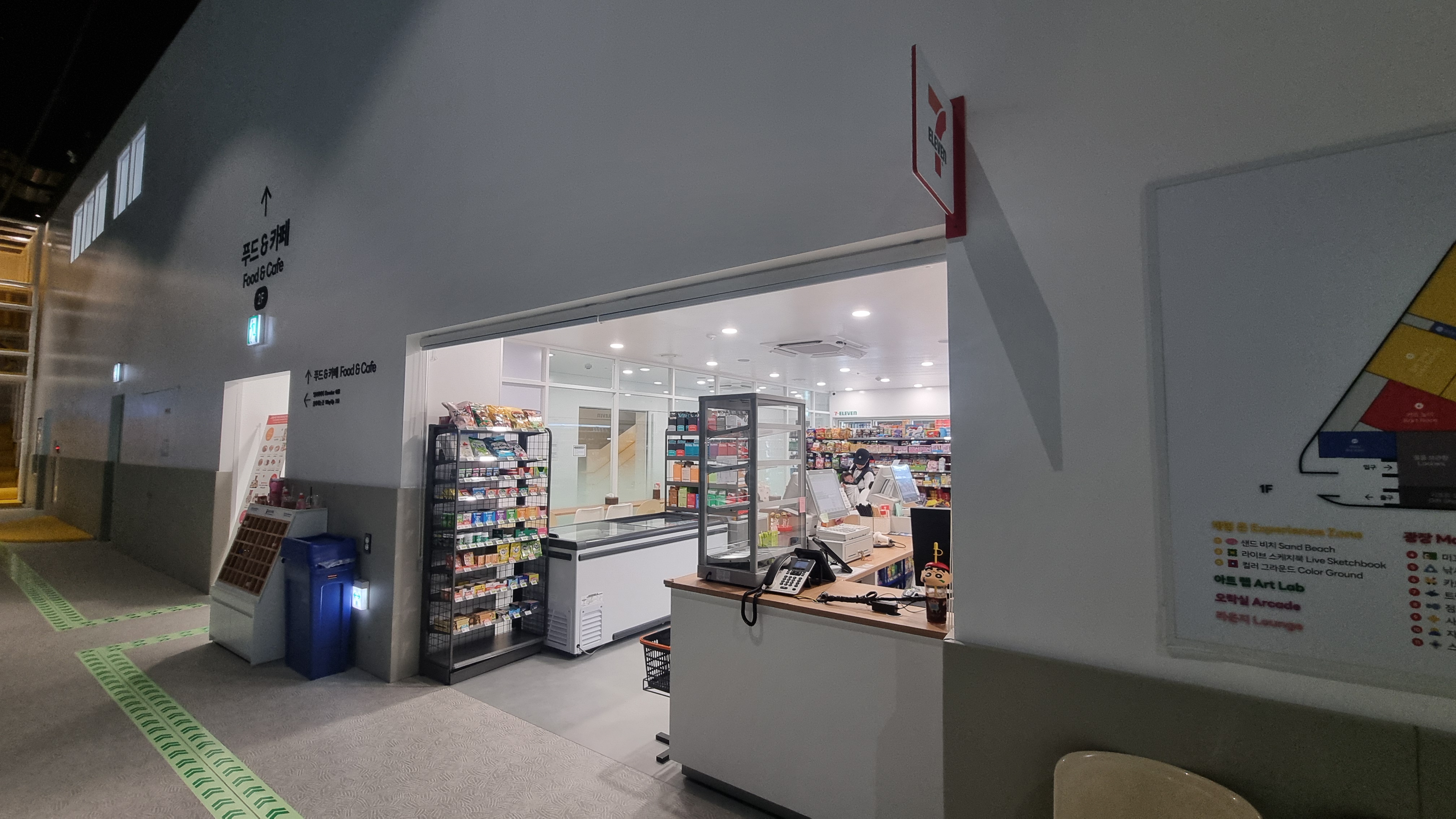 1층에는 세븐일레븐 편의점이 있어 각종 간식과 라면 등을 사 먹을 수 있습니다. 음식물은 모두 편의점 내부 테이블에서만 먹을 수 있는데 테이블 수가 많지는 않습니다. 2층으로 올라가면 넓은 공간의 푸드 코트와 베이커리류를 즐길 수 있는 카페도 있습니다.