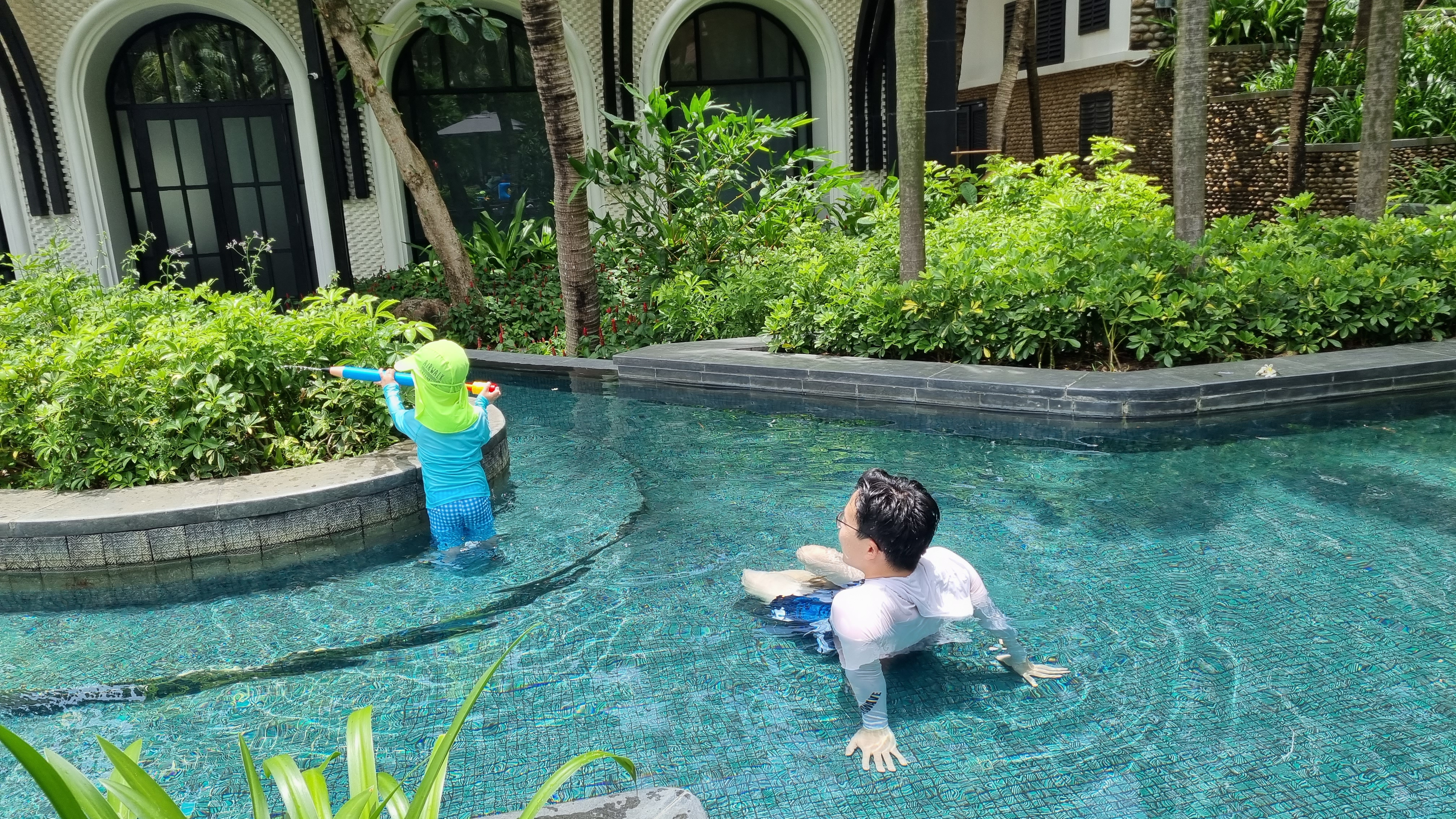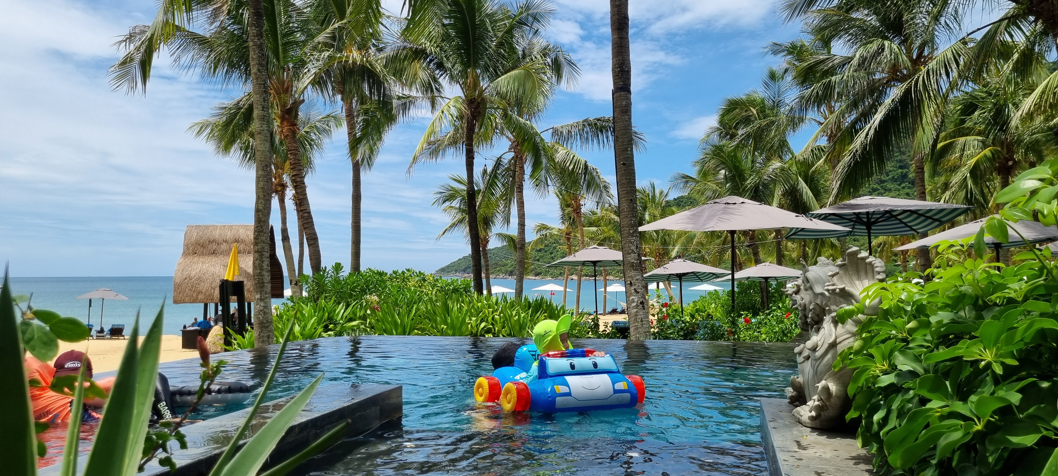 메인 수영장은 아담한 사이즈입니다. 옆에 구석에는 유아들이 놀 수 있는 정말 작은 크기의 얕은 풀도 있습니다. 크기는 작지만 이용객도 많지 않아 복잡한 느낌은 없습니다. 리조트에는 이 메인 수영장 말고도 인스타 사진에 많이 등장하는 풀이 2층에 또 있는데요. 그 풀이 사실 제일 경치가 멋지나 아쉽게도 노키즈 존이어서 저희는 이용하지 않았습니다. 아이 없이 방문하시는 분들은 그 풀에서 사진도 많이 찍고 여유로운 시간을 보낼 수 있을 것 같습니다.